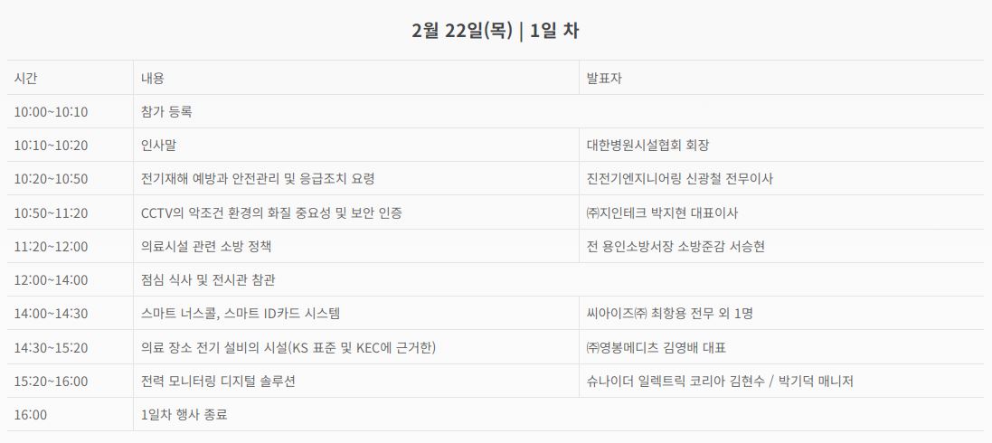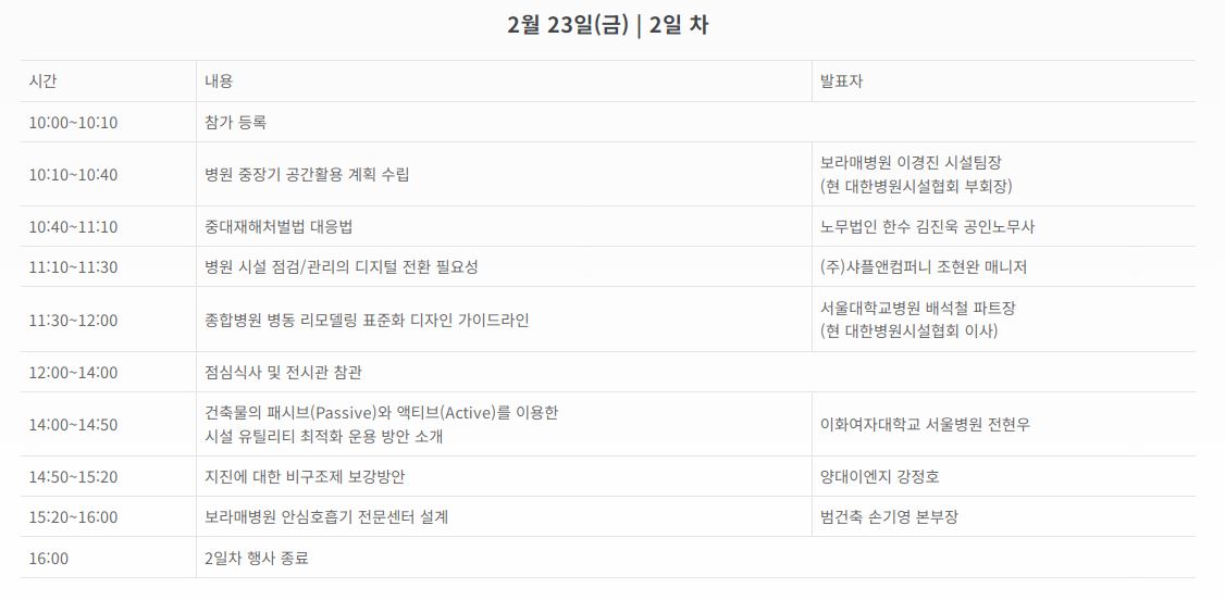 2024년 2월 대한병원시설협회에서 세미나를 개최합니다. 소방, 재해, 안전, 영상보안, 출입통제, 에너지관리, 전기설비, 리모델링 및 설계 등 병원 시설물 관리에 대해 소개하고 미래 비전을 제시한다고 합니다.