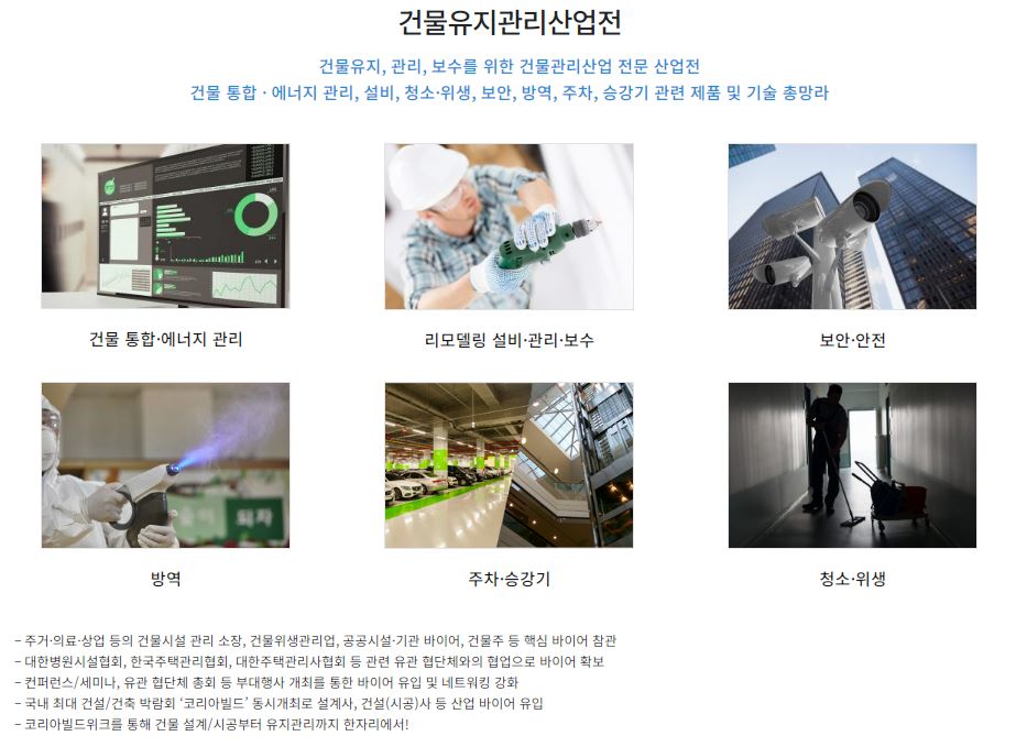 건물유지관리산업전은 건물유지, 관리, 보수를 위한 전문 산업전으로 건물 통합/에너지 관리, 설비, 청소/위생 등 관련 제품과 기술을 총 망라하는 전시회라고 합니다. 건축물이 노후화 되고 시설관리 시장의 변화 등 여러 개최배경도 있네요.